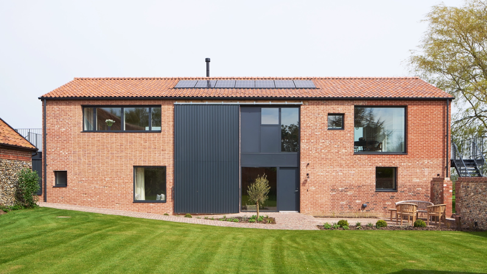 Steel first-floor entrances provide outdoor access to the wonderful views on both sides of the barn and direct access to the garden and terraced areas