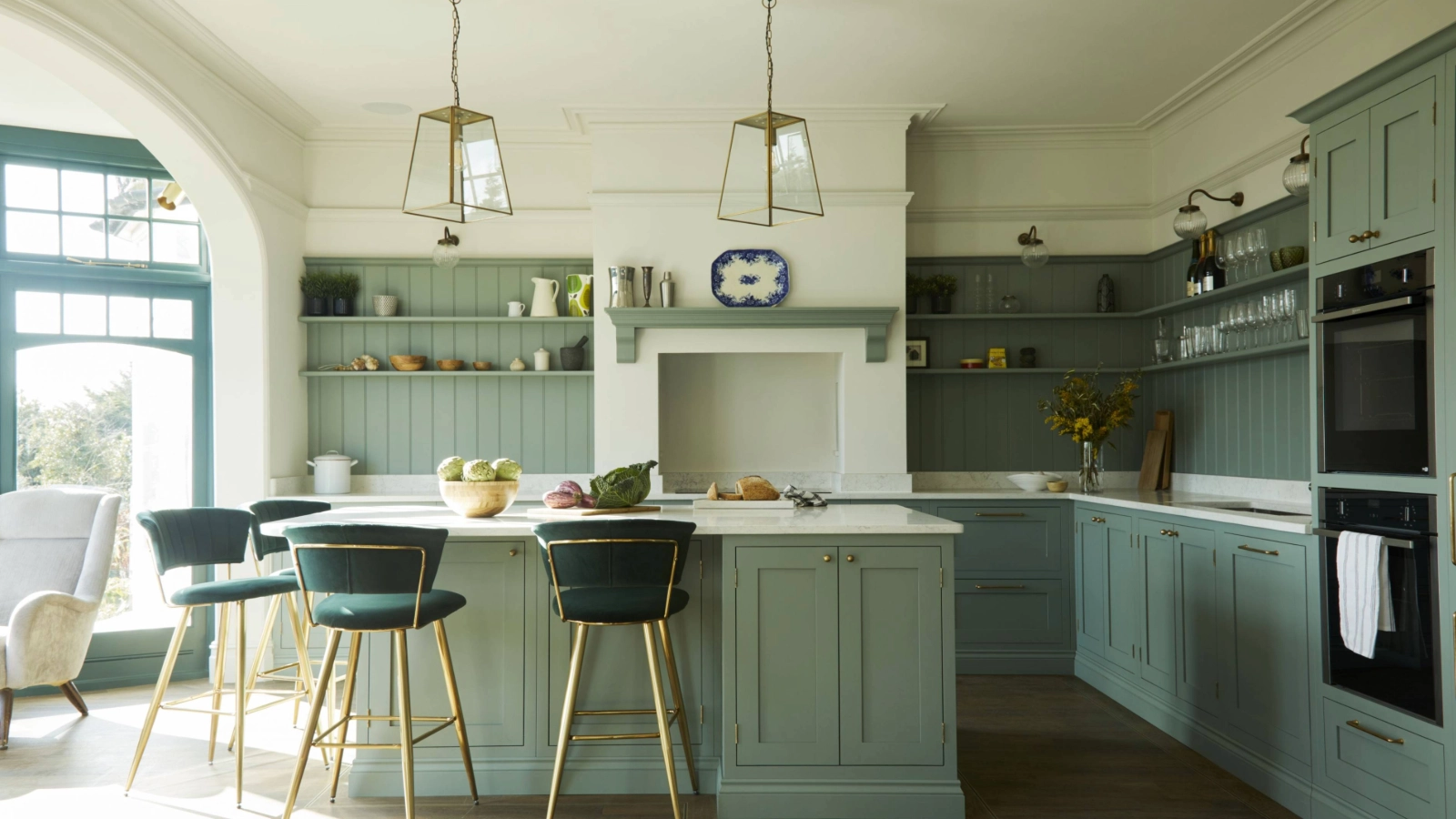 When your breakfast bar stools are your main seating each day, they need to be visually appealing as well as practical and comfortable. In this soft green, Shaker style kitchen, the added pop of red on the bar stools is a great kitchen decor idea and ties in neatly with the artwork and kitchen blind.