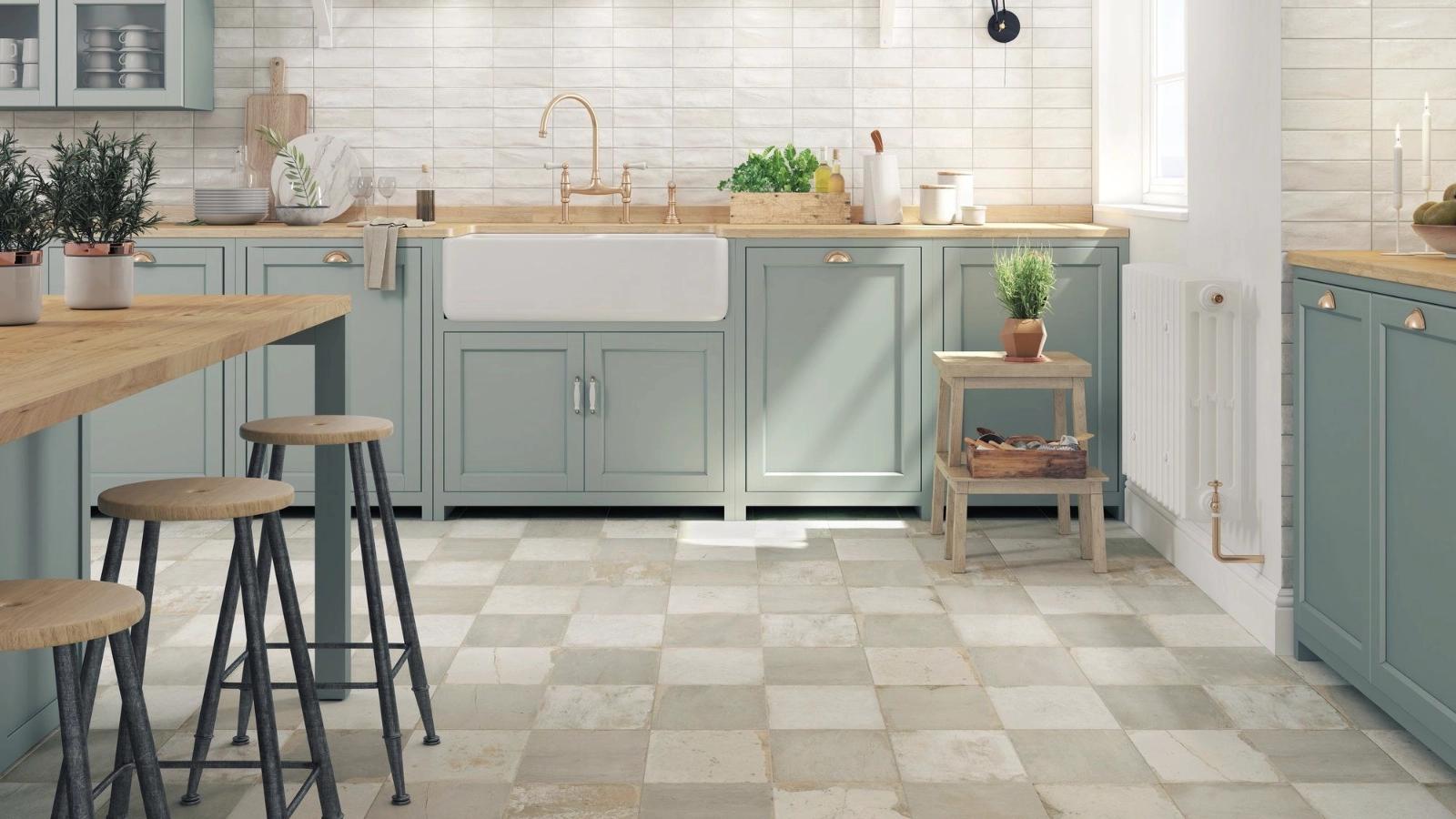 Where your kitchen cabinets take centre stage with a bold colour, use neutral flooring to provide a backdrop. Investing in good-quality product, like a natural stone flooring, will mean it could well outlast the cabinets themselves.