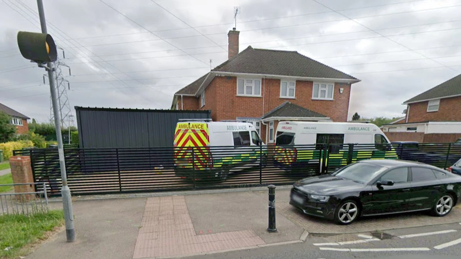 The front drive, fully block-paved, can accommodate multiple vehicles, including two ambulances already on site, along with a people carrier and a flatbed.